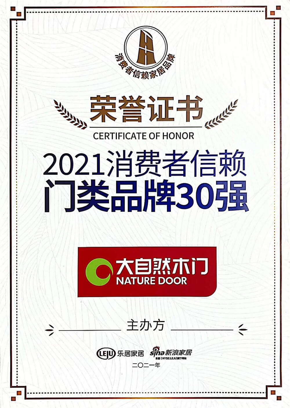 2021年12月18日,由樂居家居主辦,新浪家居承辦,CCTV·大國品牌、中國質量新聞網·家居、家頁傳媒、大國中居聯合主辦的『智見·2021中國家居新時代盛典暨金致獎頒獎典禮』于廣東佛山盛大開幕。歷經品類30強品牌評選、網絡票選及專家評審等環節,榜單終于正式揭曉,大自然家居榮膺『智見·家居新時代』2021消費者信賴十大家居品牌以及2021年消費者信賴門類品牌30強雙獎項。