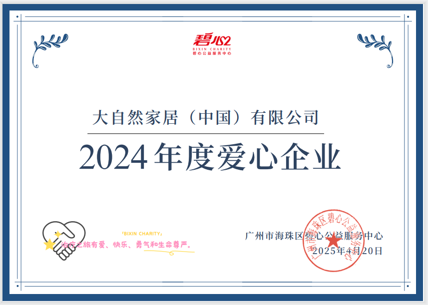 4月20日,大自然家居作為愛心典范企業,受邀出席碧心公益主辦的“春天的回信——2025年度總結及答謝盛會”,并獲頒愛心企業感謝狀。這份殊榮,此殊榮,既是大自然家居多年來深耕公益領域的又一力證,亦將成為激勵大自然家居持續踐行“商業向善”理念的動力來源。